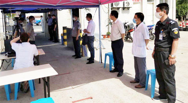 演练按照考试报名和考试全过程工作规范进行模拟,包括学生进校报名、间隔排队、消毒、测量、扫码、发热人员应急处理等环节进行。演练组还实地检查了备用考场、考场消毒等工作落实情况。