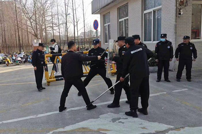 演练前,派出所民警首先向在场的保安队员讲解启动防暴恐的几种场景,详细讲解如何使用盾牌、长棍、腰叉、脚叉等防暴器械。几名民警相互配合向保安队员演示了如何相互配合使用防暴器械制服“暴徒”的过程。随后,保安队员按照民警的演示过程进行了实操训练。整个演练过程,校警安保力量配合得力,场景真实、生动、逼真,气氛紧张,达到了演练的预期效果。