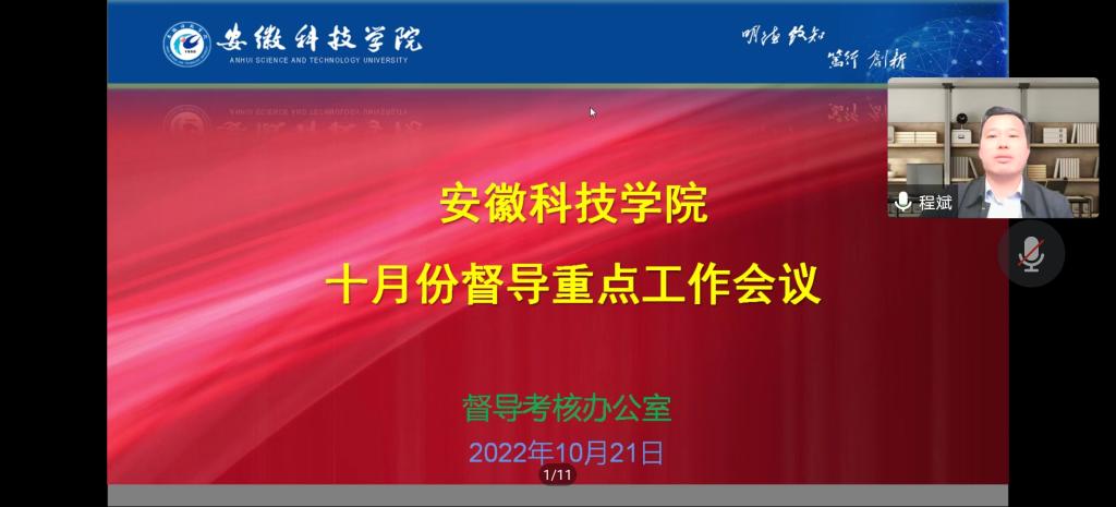 为加强教学督导与教学质量监控工作,保障学校教学工作顺利进行,提升教育教学质量,10月21日下午,督导考核办公室利用腾讯会议平台,召开教学督导线上工作会议,全体校督导员、院督导组组长及督导考核办公室工作人员参加了会议,会议由督导考核办公室程斌主任主持。