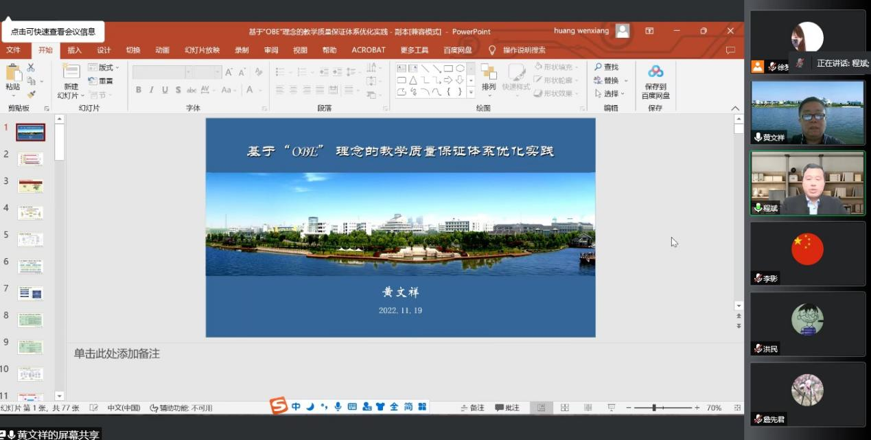 会议的第一阶段常熟理工学院教学质量管理处黄文祥教授作培训报告。文祥围绕基于“OBE”理念的教学质量保证体系优化实践主要从教学质量保证体系构建、教学质量监控工作内容、质量保证体系优化思考与实践等三个方面进行了系统阐述,既有对指标内涵的深入解读,也有对工作重点任务的梳理分析,既有理论的广度和深度,又有实践的经验与启示,让与会者受益匪浅。报告后,黄文祥还与与会人员代表,就质量保障建设的热点和难点问题,进行了专门指导。