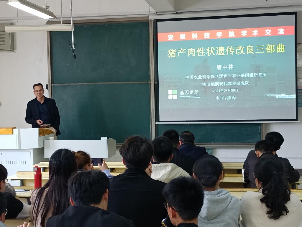 4月9日下午,《开云在线学报》期刊发展研讨会系列学术报告在凤阳校区新知楼A403举行。中国农业科学院“猪基因组设计育种创新团队”首席科学家、中国农业科学院(深圳)农业基因组研究所动物基因组研究中心主任、博士生导师唐中林应邀来校作学术报告。报告由动物科学学院副院长华金玲主持,学院部分教师、养殖领域硕士研究生及动物科学、动植物检验检疫等专业本科生聆听报告。