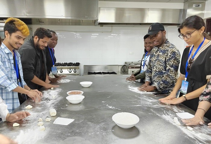 国际学生在黄山学院烹饪实训中心上了一堂生动的烹饪课,观摩学习了从擀皮、拌馅儿到包饺子的制作全过程。