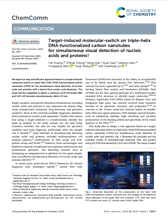 近期,我校生物医药与健康研究院刘国东团队以及2017级生命科学卓越班学生在国际著名期刊《CHEMICAL COMMUNICATION》上发表了题为“Target-induced molecular-switch on triple-helix DNA-functionalized carbon nanotubes for simultaneous visual detection of nucleic acids and proteins”(2020,DOI: 10.1039/d0cc05986b)的研究论文。《CHEMICAL COMMUNICATION》是化学领域极具影响力的期刊之一,中科院JCR分区为一区TOP期刊,其近三年平均影响因子为6.258。