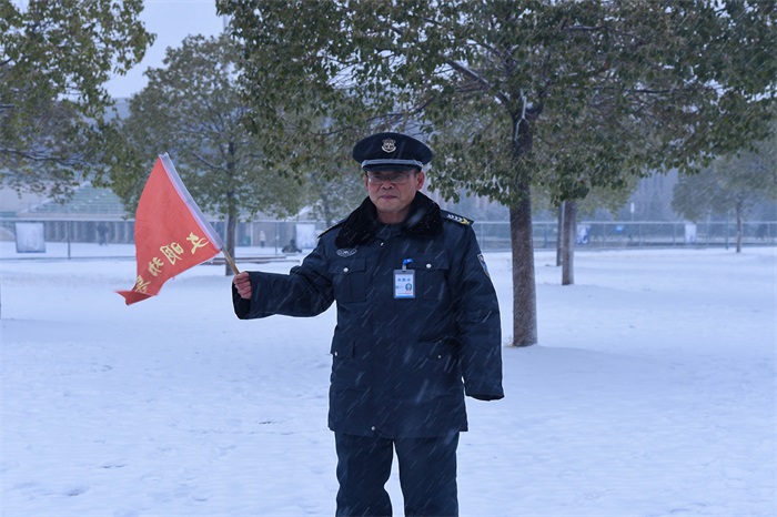 雪天路滑,细心的保安大叔不时提醒过往同学在开心的同时一定要注意安全……
