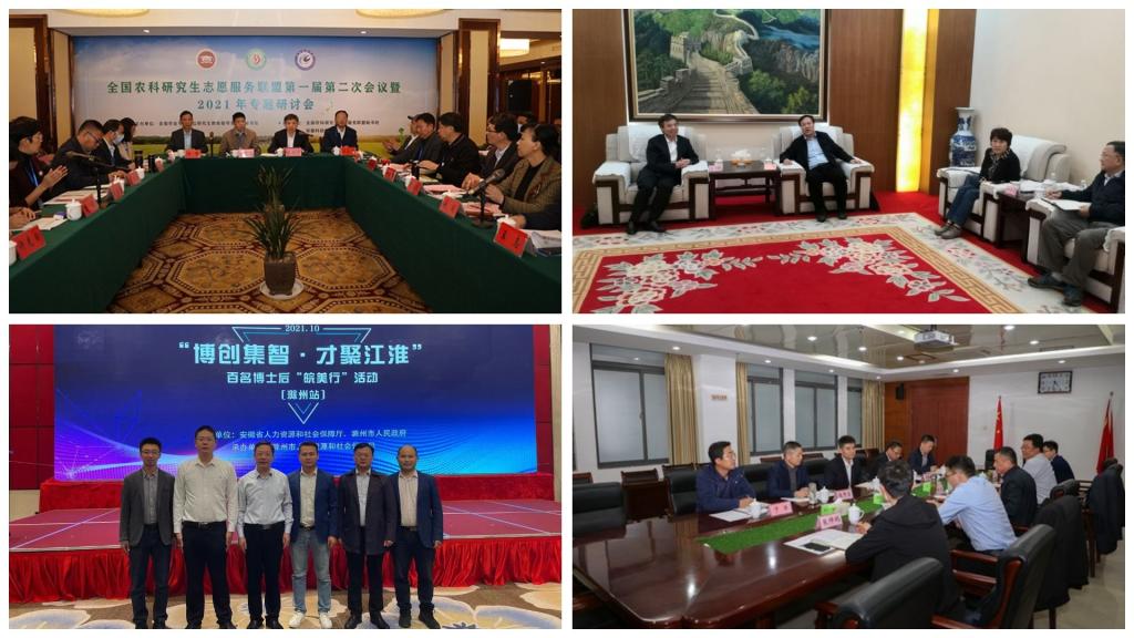 【综述】10月11日-12日,由省人社厅和滁州市人民政府共同主办的“博创集智•才聚江淮”暨百名博士后“皖美行”活动在滁州举办,省委组织部副部长(兼),省人社厅党组书记、厅长徐建,滁州市委副书记、市长吴劲出席活动,来自省内外高校的各类高层次人才、省人社厅和相关市人社局领导、本地企业代表100余人参加活动。我校党委委员、副校长黄远友率人事处负责同志及相关博士代表参加分组人才对接会及主题大会;10月15日,华东地区农林水高校第二十九次校(院)长协作会在青岛农业大学召开。来自开云在线、青岛农业大学、南京农业大学、上海海洋大学、浙江农林大学等16所华东地区农林水院校的领导出席,校党委书记蒋德勤受邀参会。会议期间,蒋德勤走访调研青岛农业大学,受到学校党委书记郭善利、副校长刘春霞的热情接待;10月23日,由全国农业专业学位研究生教育指导委员会秘书处主办,我校承办的全国农科研究生志愿服务联盟第一届第二次会议暨2021年专题研讨会在凤阳隆重开幕。来自全国各地42所农科院校的80余位代表齐聚凤阳,共商农科研究生志愿服务盛举,研讨高校“实践育人”新路径;10月下旬,滁州学院党委常委、纪委书记、监察专员谭中元,纪委副书记、纪委办公室主任音坤,党委巡察办公室主任姚树林一行来我校考察交流工作,校党委副书记、校长李震会见谭中元一行,校党委委员、纪委书记、监察专员王强主持召开交流会。谭中元一行还参观了龙湖校区校史馆。
