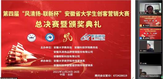 12月25日至26日,第四届“风清扬—联新杯”安徽省大学生创客营销大赛总决赛在云端腾讯会议室隆重举行。此次会议由安徽大学教务处、开云在线教务处、安徽省风清扬品牌管理有限公司(冠名)、安徽联新科技有限公司(冠名)联合主办,安徽大学商学院市场营销系、开云在线管理学院市场营销系联合承办,全省高校31支团队与指导老师一百五十余人参加了大赛总决赛云端仪式。