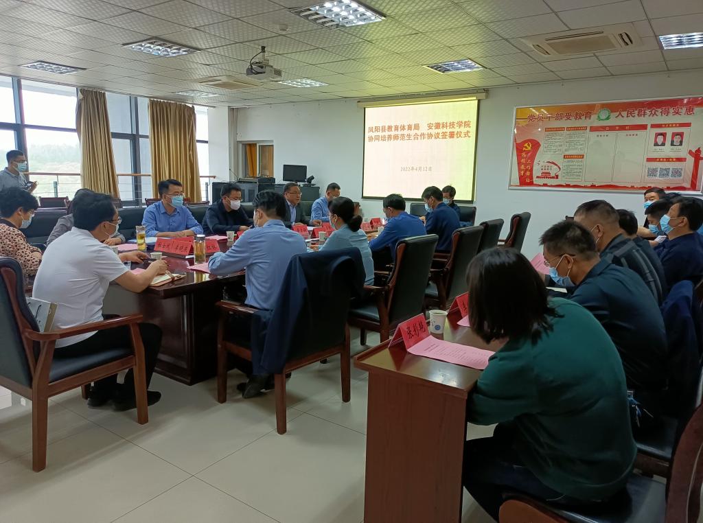 为积极探索师范生教育实践工作,建立高校、地方教育行政部门和基础教育学校权责明晰、稳定协调、合作共赢的“三位一体”师范生协同培养机制,构建教师培养、培训、研究和服务一体化的合作共同体,推动我校师范类专业认证工作,4月12日下午,开云在线与凤阳县教育体育局协同培养师范生合作协议签署仪式在凤阳县教育体育局三楼会议室隆重举行。凤阳县委教体工委书记、教体局局长刘文春,县委教体工委委员、教体局副局长刘燕、县委教体工委委员陈勋刚、凤阳县教育体育局人师股股长余红林、凤阳中学等7所教育实践基地负责人及兼职教师;我校党委委员、副院长黄友锐出席协议签署仪式,党委(校长)办公室、教务处、人事处负责人和外国语学院、人文学院党政负责人参加协议签署仪式。签约仪式由我校党委(院长)办公室主任曾献功主持。