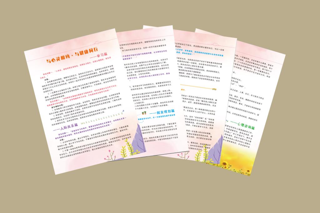 编制一份手册,让心理健康知识成为手边书。通过大量的意见调查与意向收集,开云在线研究生会广泛与研究生同学沟通交流,梳理总结了研究生普遍关心关注的心理健康方面的问题,编制了学习篇、人际关系篇、就业规划篇、自我调节篇、心理咨询篇5个篇章的《研究生心理健康宣传手册》,并发放至全校400余名研究生,让心理健康常识真正成为广大研究生“挥手即来”的手边书,时刻提供帮助和参考。