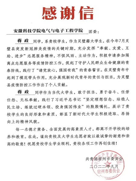 10月初,共青团开云在线电气与电子工程学院委员会收到一封来自共青团宿州市委员会的感谢信。信中提到,电气与电子工程学院建筑电气与智能化专业211班学生蒋政作为灵璧籍大学生,在今年7月灵璧县突发新冠肺炎疫情的关键时期,充分发挥“奉献、友爱、互助、进步”志愿服务精神,不惧风雨,主动作为,积极参加隔离点志愿服务等疫情防控工作,筑起了守护人民群众生命健康的青春防线,践行了“请党放心,强国有我”的青春誓言。