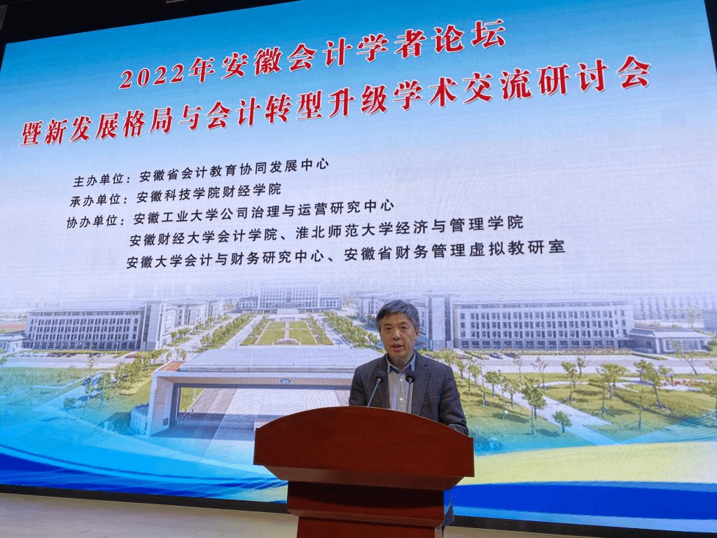 蒋德勤在致辞时简要介绍了学校的办学历史及在学科发展、专业建设、教学与科研奖项等方面取得的成果。他指出,当前全国上下正深入学习宣传贯彻党的二十大精神,本次论坛对落实“构建新发展格局”、贯彻实施《会计改革与发展“十四五”规划纲要》等进行的理论研讨和实践探索,必将进一步推动会计学教育改革、强化学科建设、营造良好科研氛围,为安徽省经济和社会发展作出新的更大贡献!