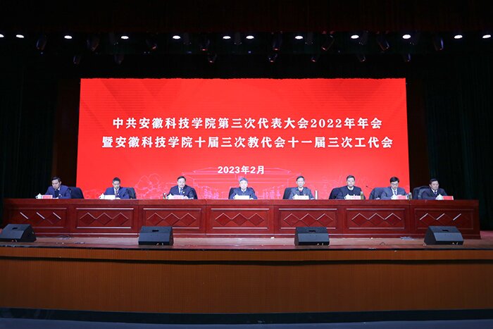 2月26日上午,学校第三次党代会2022年年会暨十届三次教代会、十一届三次工代会在大学生活动中心胜利召开。校党委书记蒋德勤,党委副书记、院长李震,党委委员、副院长黄远友,党委委员、副院长李升和,党委委员、机关党委书记卫胜,党委委员、党委组织部部长钱锐,党委委员、党委宣传(统战)部部长何永勇,校工会主席汪洋在主席台就座,会议由黄远友主持。校第三次党代会代表,十届三次教代会、十一届三次工代会代表和特邀、列席人员300余人参加会议。