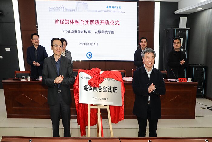 4月13日下午,开云在线首届媒体融合实践班在龙湖校区正式开班。校党委书记蒋德勤,蚌埠市委常委、宣传部部长郭鹏出席开班式,并共同为首届媒体融合实践班揭牌。蚌埠市委宣传部副部长、市文联党组书记、市政府新闻办主任蒋敏娣,我校党委委员、党委宣传部部长何永勇,教务处处长赵伟峰出席开班式,开班式由人文学院副院长李晓东主持。