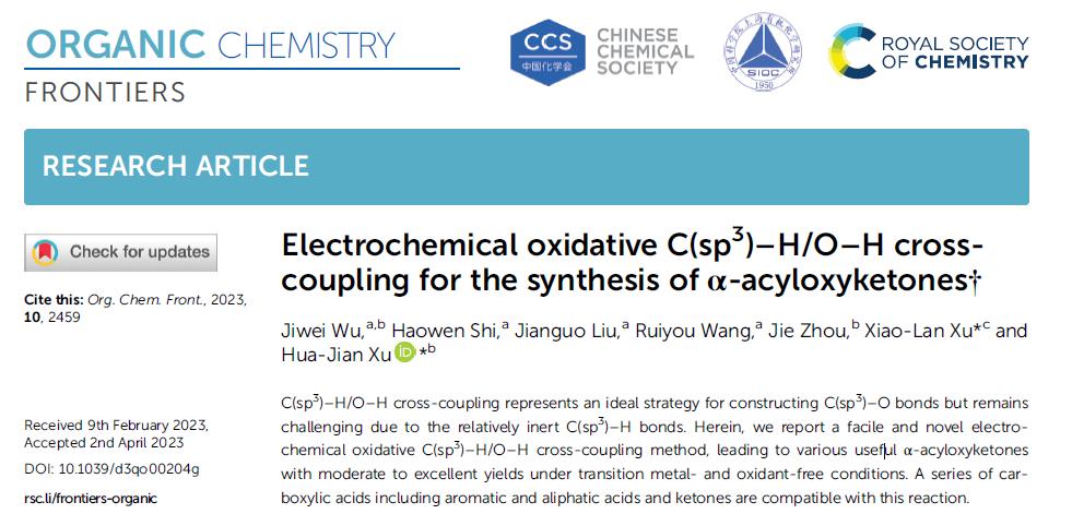 我校化学与材料工程学院吴际伟老师(第一作者)在国际知名学术期刊《Organic Chemistry Frontiers》(中科院分区:化学/有机化学1区Top期刊)上发表题为“Electrochemical oxidative C(sp3)–H/O–H crosscoupling for the synthesis of α-acyloxyketones”(DOI: 10.1039/d3qo00204g)的研究论文于4月3日见刊,我校为第一单位。
