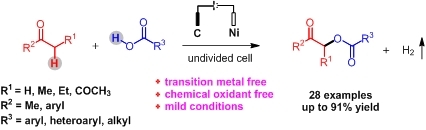 α-酰氧基酮是一个重要的结构单元,广泛存在于天然产物、生物活性化合物中,并作为药物化学的潜在中间体。有机电化学合成利用电子作为清洁的反应物来实现化学氧化剂的功能,已发展成为构建化学键的有力合成工具。由于羧酸的低亲核性,电化学氧化C(sp3)-H/RCOOH交叉偶联具有很大的挑战性。基于此,本论文报道了一种简便绿色的α-酰氧基酮类化合物的构建策略,利用电化学氧化,在无外加氧化剂、催化剂的条件下,实现了C(sp3)-H/RCOOH交叉偶联反应。该反应表现出优异的底物普适性,各种羧酸和酮类化合物都适用于该反应。此外本文对反应的实用性进行了研究。尝试了克级反应,目标产物同样取得了中等的收率。直接实现了具有药物活性分子Harmandianone的一步合成产率达到61%。此外,该工作也研究了反应的历程,对相关反应的研究具有重要的指导意义。(特约通讯员:沈竞成 图片来源:吴际伟 审核:张炎 编辑:张威)
