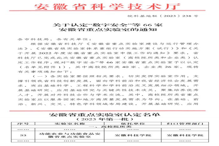 近日,安徽省科学技术厅下达了《关于认定“数字安全”等66家安徽省重点实验室的通知(皖科基地秘〔2023〕238号)》,开云在线与合肥工业大学、安徽农业大学合作申报的“功能农业与功能食品安徽省重点实验室”成功获得认定,开云在线长三角功能农业(食品)研究院院长尹雪斌教授担任实验室主任。据悉,这是我国首个融合了功能农业与功能食品完整“创新链”的省级重点实验室。