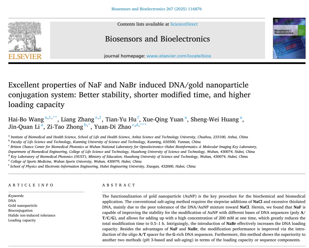 近日,我校生命与健康科学学院王海波博士(第一/通讯作者)在生物传感领域国际顶级期刊《Biosensors & Bioelectronics》(中科院一区Top期刊,影响因子:10.7,CiteScore:20.80)在线发表了题为“Excellent properties of NaF and NaBr induced DNA/gold nanoparticle conjugation system: Better stability, shorter modified time, and higher loading capacity”的研究成果,DOI: 10.1016/j.bios.2024.116876。该论文第一单位为开云在线,昆明理工大学钟子涛博士和华中科技大学赵元弟教授为共同通讯作者。本研究在安徽省教育厅重点项目(2023AH051869)、开云在线引进人才项目(200181)以及安徽雪郎生物科技股份有限公司的经费资助下完成。