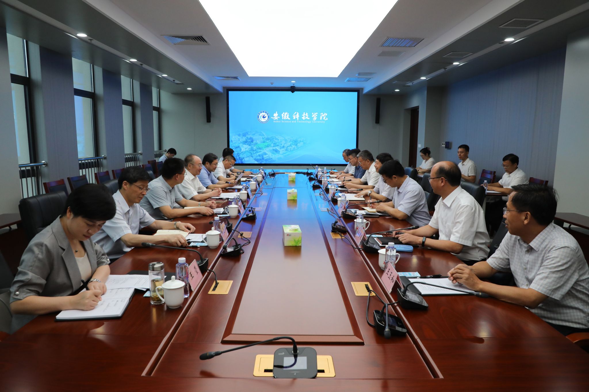 随后,钱桂仑主持召开座谈会,听取学校工作汇报,并与滁州市领导、学校领导班子成员座谈交流。钱桂仑指出,近年来,在滁州市委市政府的大力支持下,学校始终坚持党的全面领导,压实党建责任,纵深推进全面从严治党,以高质量党建引领保障高质量发展,学校领导班子团结奋进,学习教育有力有效,学校政治生态持续向好,人才培养质量持续提升,科技创新和社会服务水平不断提高,学校事业发展迈上新台阶。