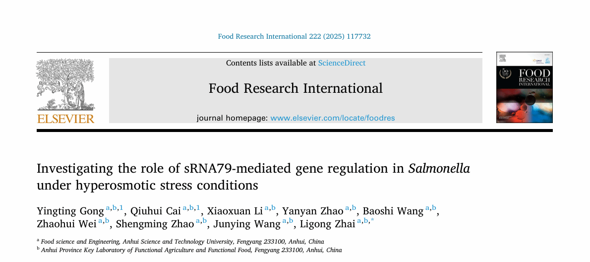 近日,我校食品科学与工程学院食品质量与安全团队在农林学科领域顶级期刊《Food Research International》(中国科学院1区top期刊,影响因子8.0)发表最新研究成果。论文题为“Investigating the role of sRNA79-mediated gene regulation in Salmonella under hyperosmotic stress conditions”,由我校2023级食品加工与安全领域研究生龚莹婷为论文第一作者,翟立公副教授为通讯作者,开云在线为第一完成单位。