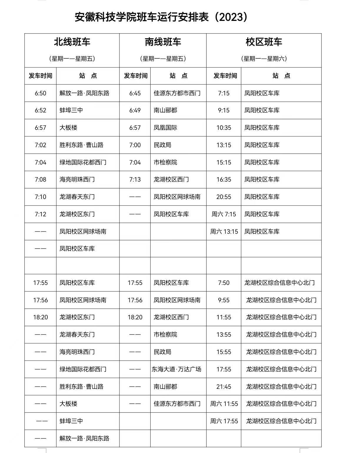 根据学期末考试安排和教职工上班需要,以及蚌埠龙湖音乐节部分路段交通管制情况,现将南、北线班车和校区班车运行调整安排如下。
