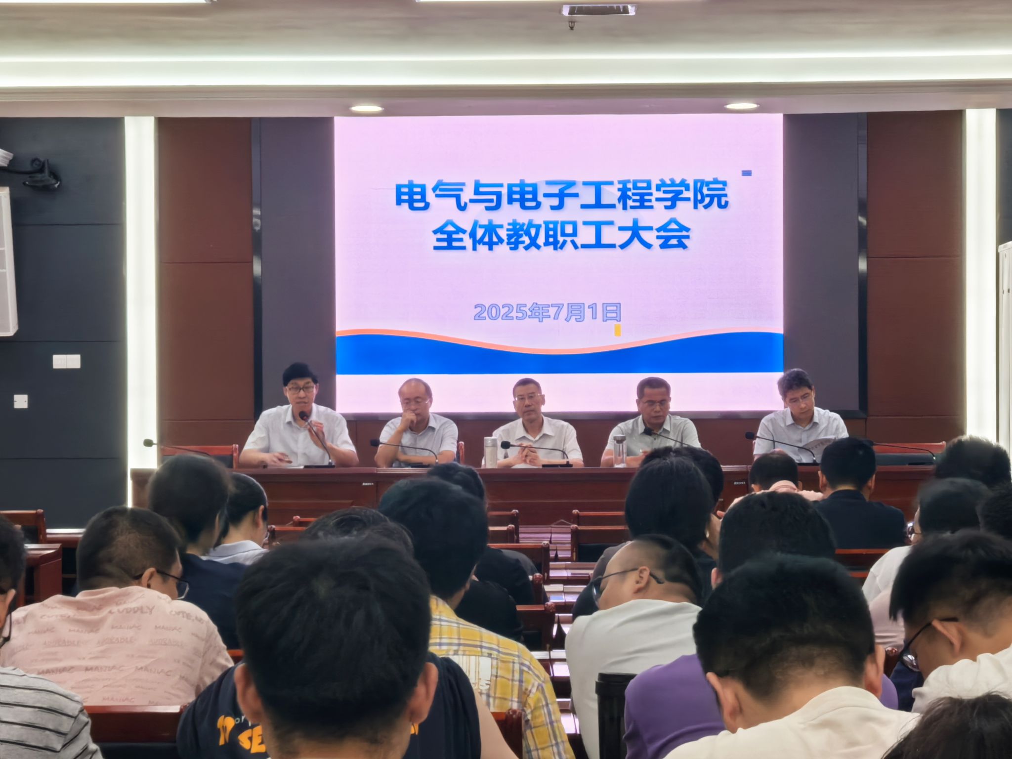 7月1日下午,电气与电子工程学院在西辅楼111会议室召开全体教职工大会,学院党委书记骆海邦,党委副书记、院长夏显明,党委副书记尚磊,副院长国海,副院长樊晓宇及全体教职工参加了会议,会议由骆海邦主持。