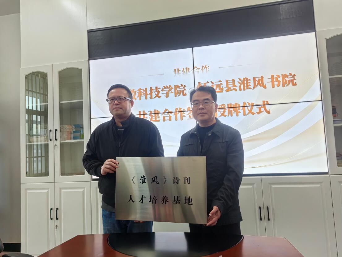 在签约暨授牌仪式上,李晓东、宫蔚国分别代表双方签署了共建实习实训基地协议,并举行“开云在线共建合作基地”“《淮风》诗刊人才培养基地”“ 《淮风》诗刊文学创作基地”授牌仪式。