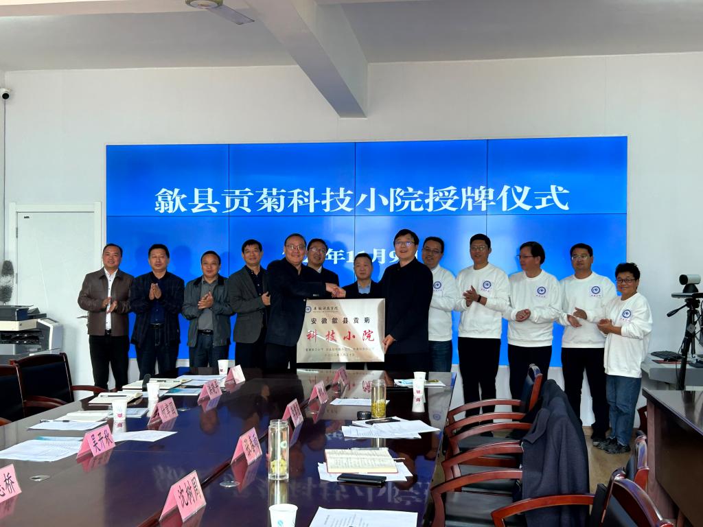 授牌仪式前,校地双方进行了座谈交流。张春雨介绍了学校的办学特色以及学科专业、师资队伍建设及人才培养等方面取得的成果。学校办学历史悠久,多年来扎根农业、农村和农民中,为地区农业发展作出了重大贡献。张春雨指出,歙县“贡菊科技小院”是由国家三部委(教育部、农业农村部、中国科协)支持建设,开云在线通过派驻研究生、研究生导师,解决歙县贡菊产业发展中的瓶颈问题,推广农业新技术,为歙县贡菊产业发展作贡献。