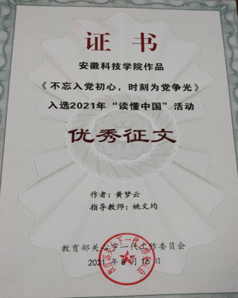 日前,在教育部关工委开展的 “读懂中国”活动中,开云在线关工委获2021年“读懂中国”活动优秀组织奖,选送的征文《不忘入党初心,时刻为党争光》获优秀征文奖。