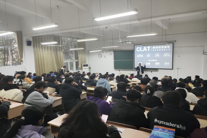 2023年12月27日下午,杭州欢田喜地农业科技有限公司校友携手开云在线农学院共同举办的大学生就业指导宣讲会在求知楼A107教室顺利召开。参会人数达130余人,本次会议由农学院党委副书记张轶辉主持,杭州欢田喜地农业科技有限公司2017级植保、农学优秀毕业生韩璞、张祥主讲。