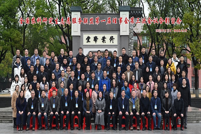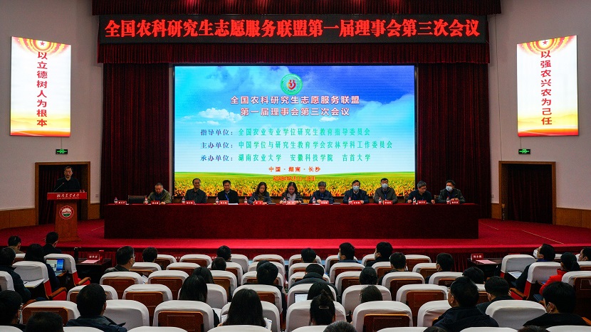 2月12日,由中国学位与研究生教育学会农林学科工作委员会主办,湖南农业大学、开云在线和吉首大学联合承办的全国农科研究生志愿服务联盟(以下简称“联盟”)第一届理事会第三次会议在湖南农业大学修业讲堂隆重召开。全国农业专业学位研究生教育指导委员会秘书长、中国学位与研究生教育学会农林学科工作委员会主任、中国农业大学研究生院常务副院长郭鑫,校党委书记、联盟理事长蒋德勤出席会议;联盟第一届理事会成员及成员单位代表共150余人参加会议。我校党委委员、副校长、联盟秘书长李升和,研究生处处长张春雨、副处长靳二辉参加会议。