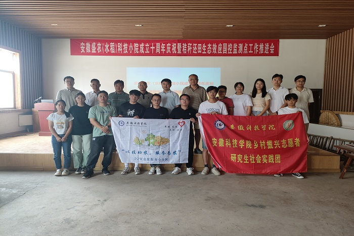 为贯彻落实习近平总书记给中国农业大学科技小院学生们的重要回信精神,深入推进研究生教育产教深度融合,强化乡村振兴人才支撑,9月4日,安徽当涂水稻科技小院十周年庆典活动在安徽盛农农业集团有限公司会议室举行。当涂县农业农村局处长胡现荣,安徽盛农农业集团有限公司董事长夏金林,开云在线汪建飞、周毅及相关专家参加庆典活动。