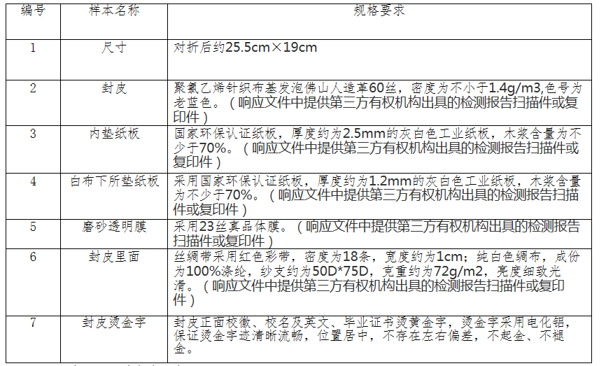 (2)封面烫金、内印校名、校徽、内衬表面采用进口牡丹特种纸、丝绸带采用红色彩带,密度约为18条,宽度约为1cm;(响应文件中提供第三方有权机构出具的检测报告扫描件或复印件)